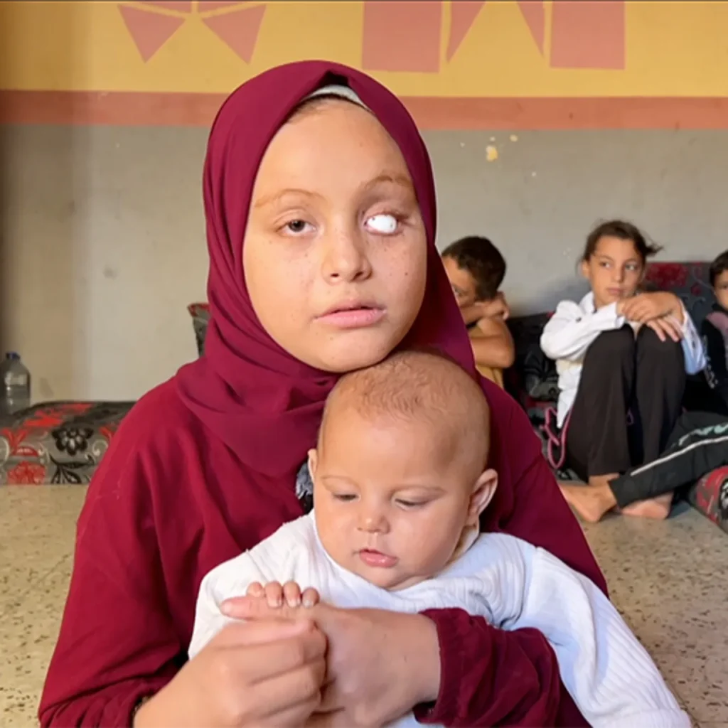 Malak suddenly stops talking, leans forward, and kisses the baby on her lap. Her sister Rahma has light hair and